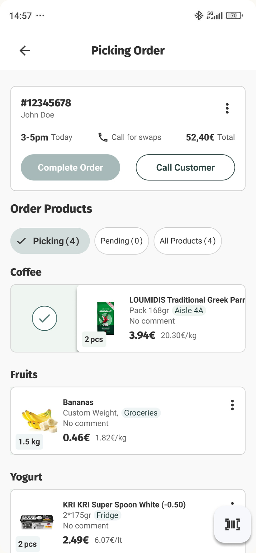 Βarcode scans confirm each SKU before it goes in the tote. No wrong items.